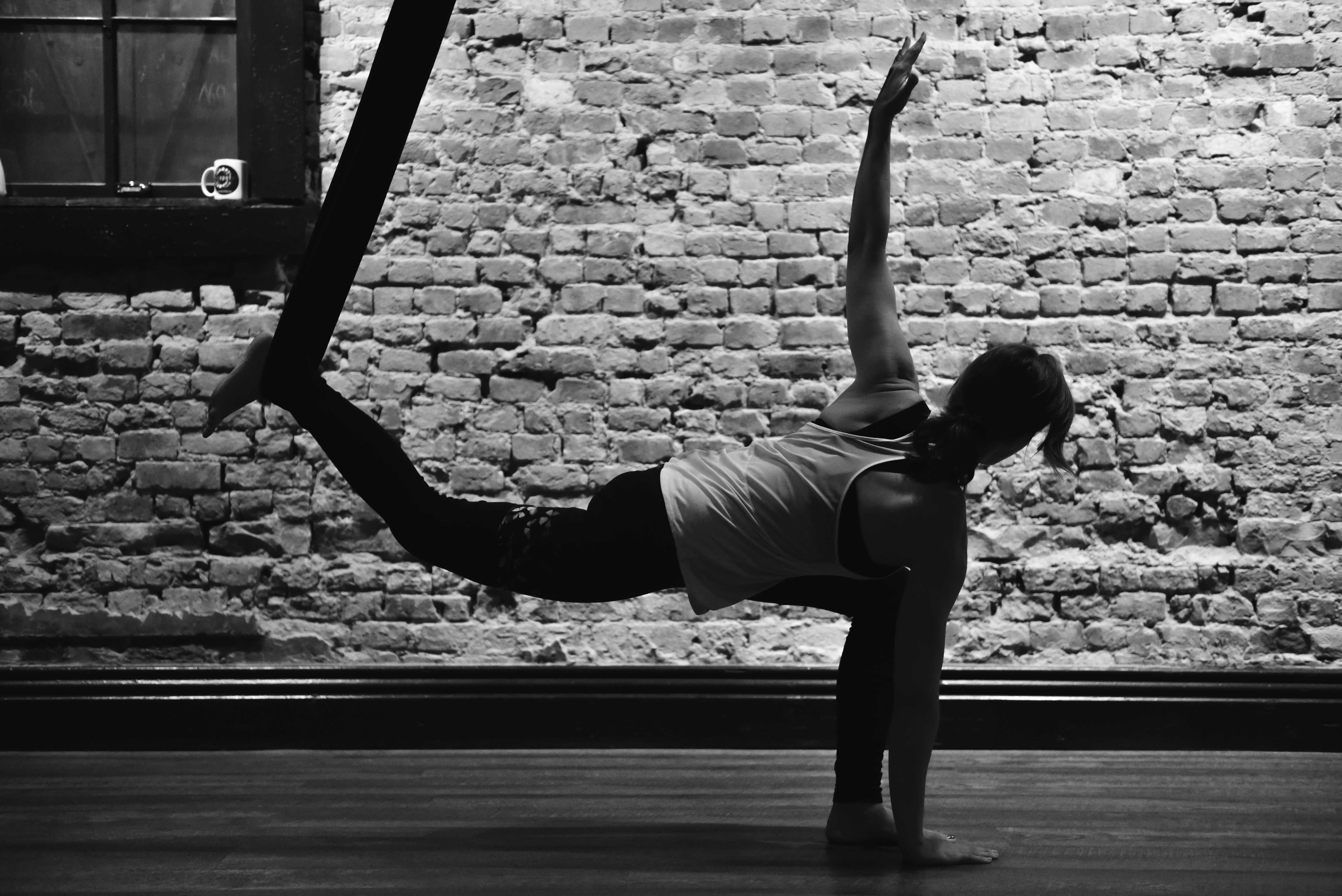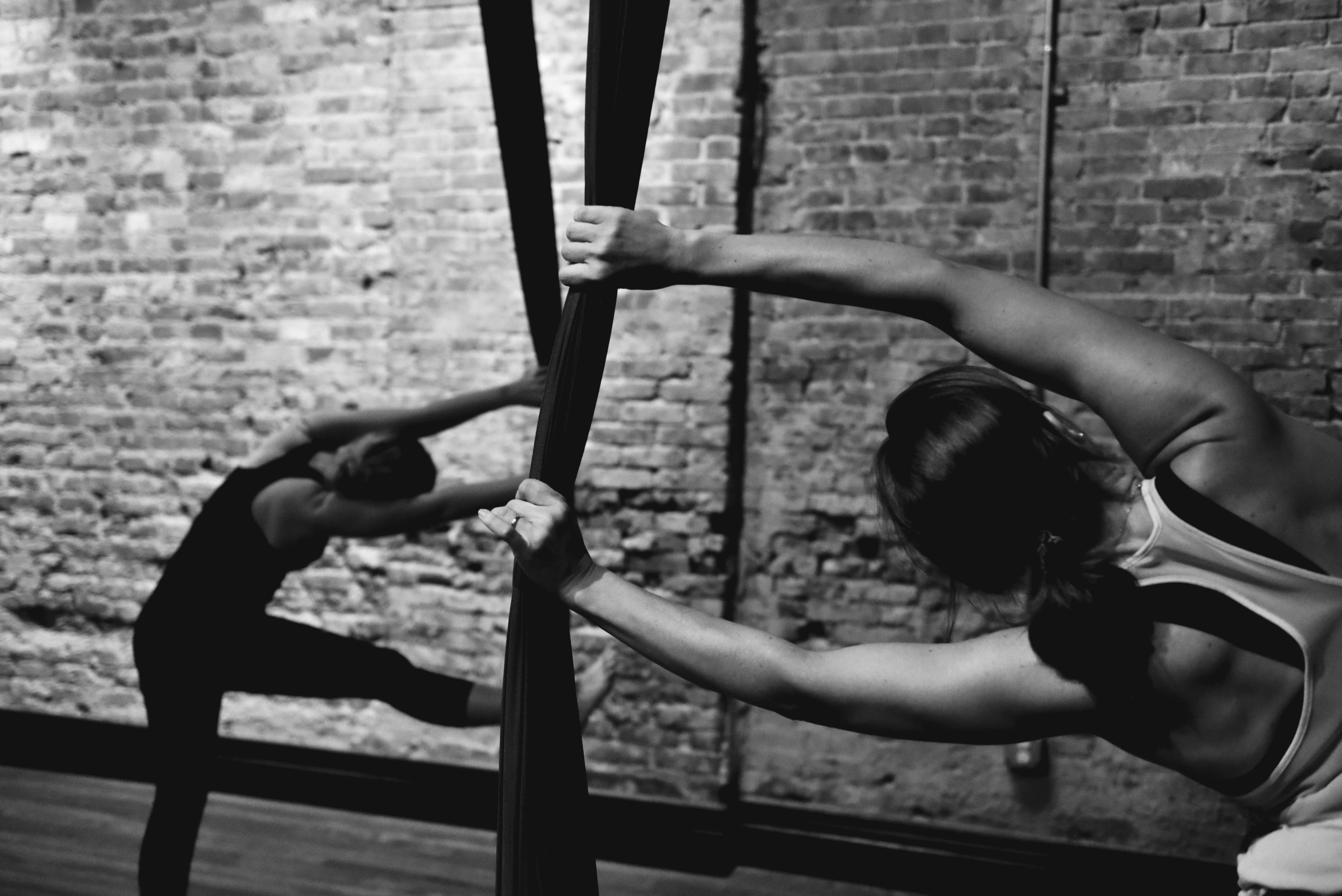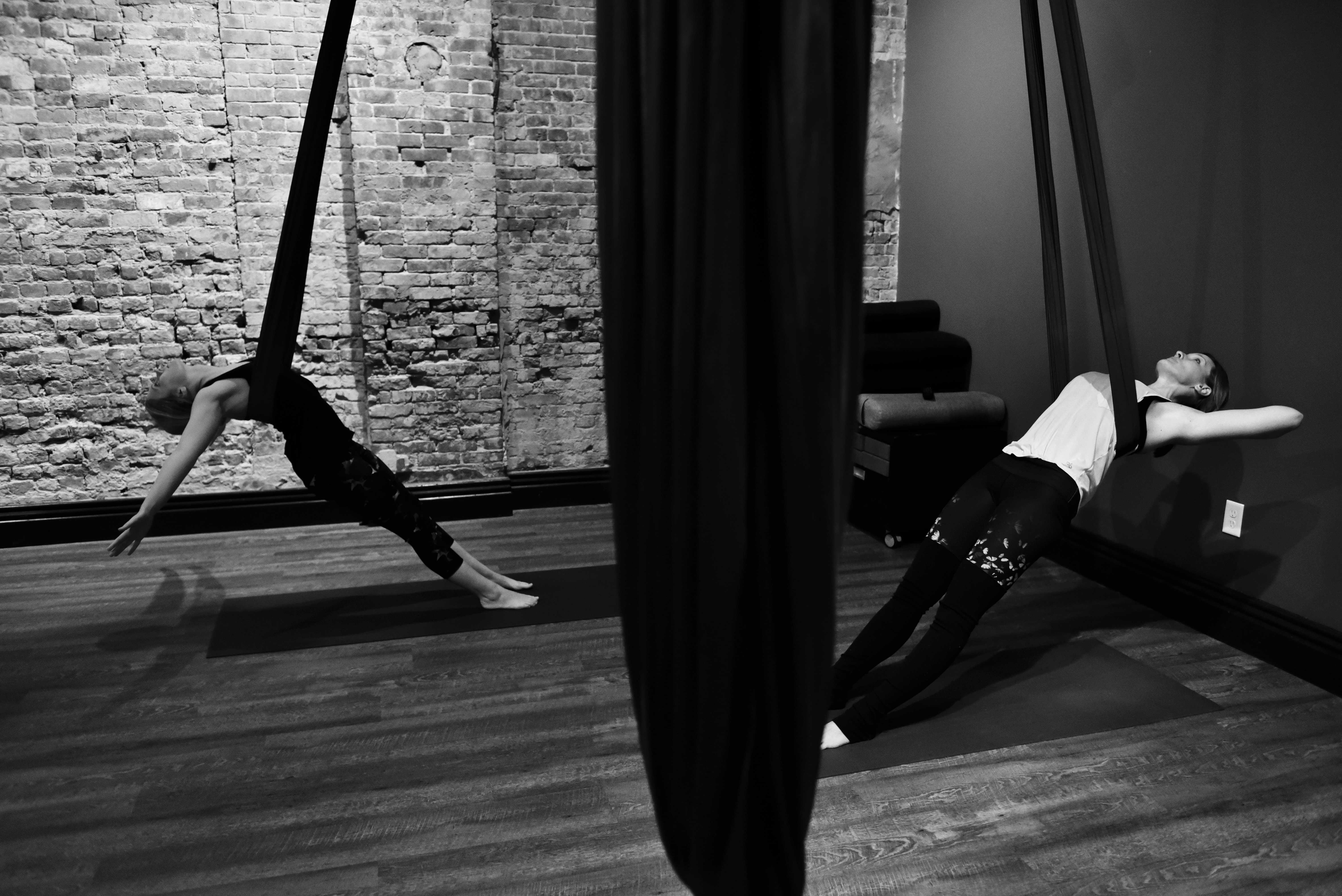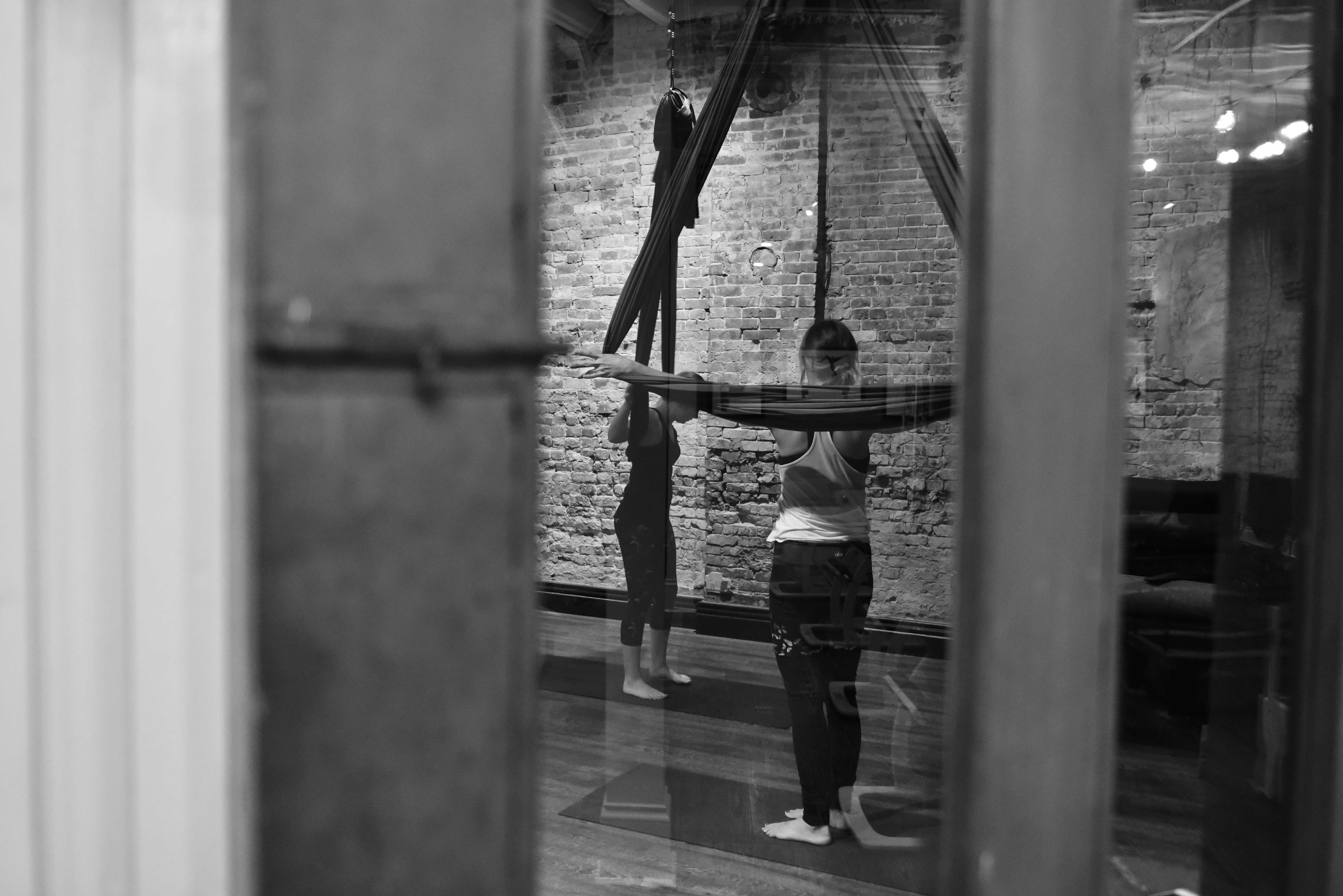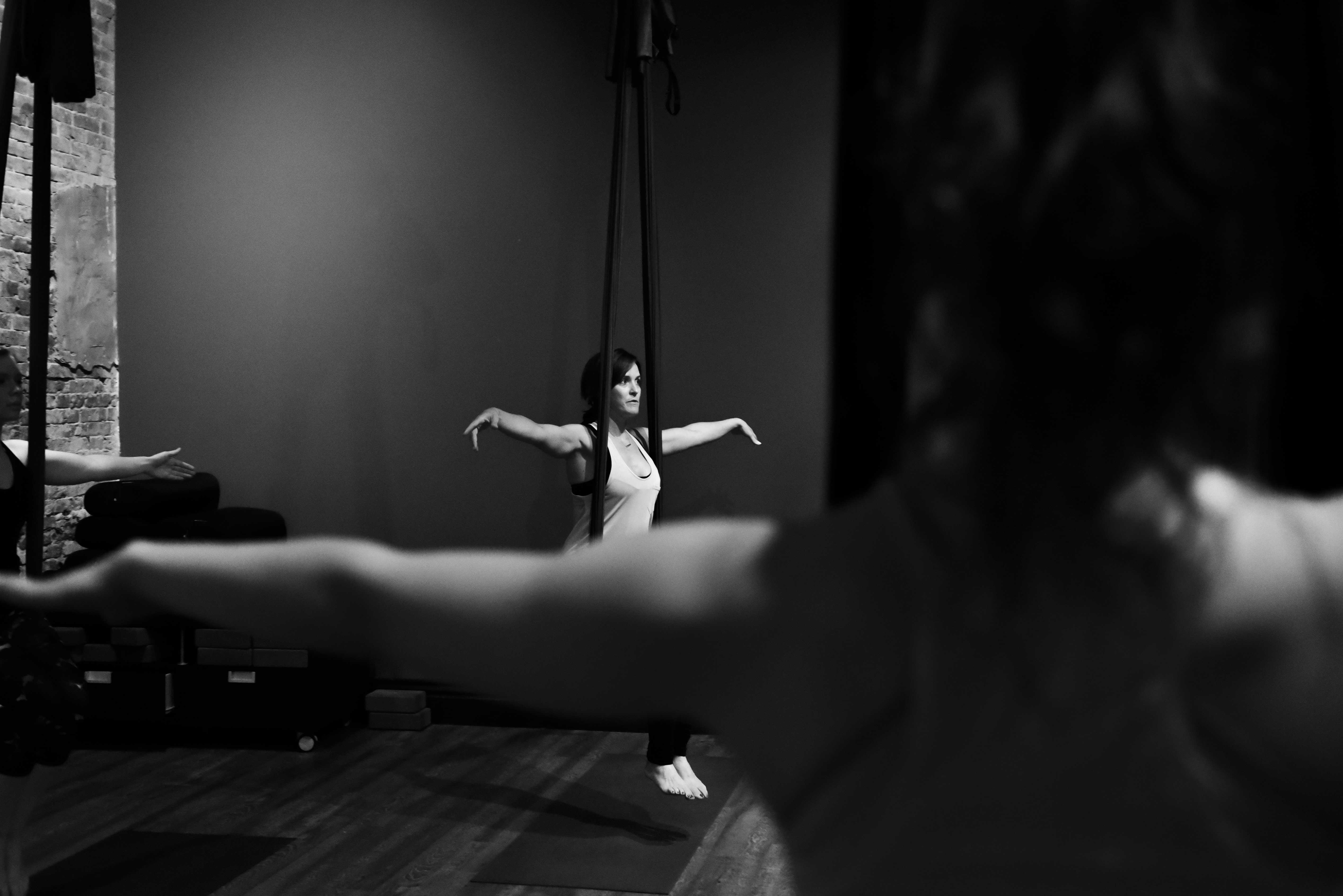 I walked into the warm, brick-lined studio. It smelled of lavender oils and held a dimly-lit charm. Glistening silks hung silent and still from the ceiling. I was instructed to pick a silk which, when slightly stretched, reached below my hips. I found a lovely black silk on the right side of the room, and I unrolled my yoga mat to begin.