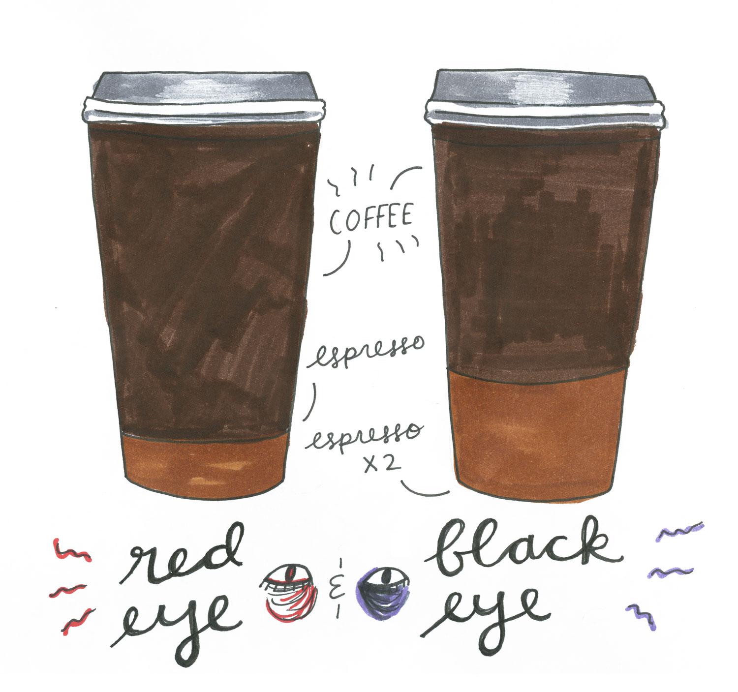 The term red eye refers to a cup of coffee with one shot of espresso. A black eye is coffee with a double shot. For reference, a shot of espresso is typically 2 ounces and contains about 80 milligrams of caffeine, whereas a 12 ounces cup of medium roast coffee contains about 120 mg of caffeine.