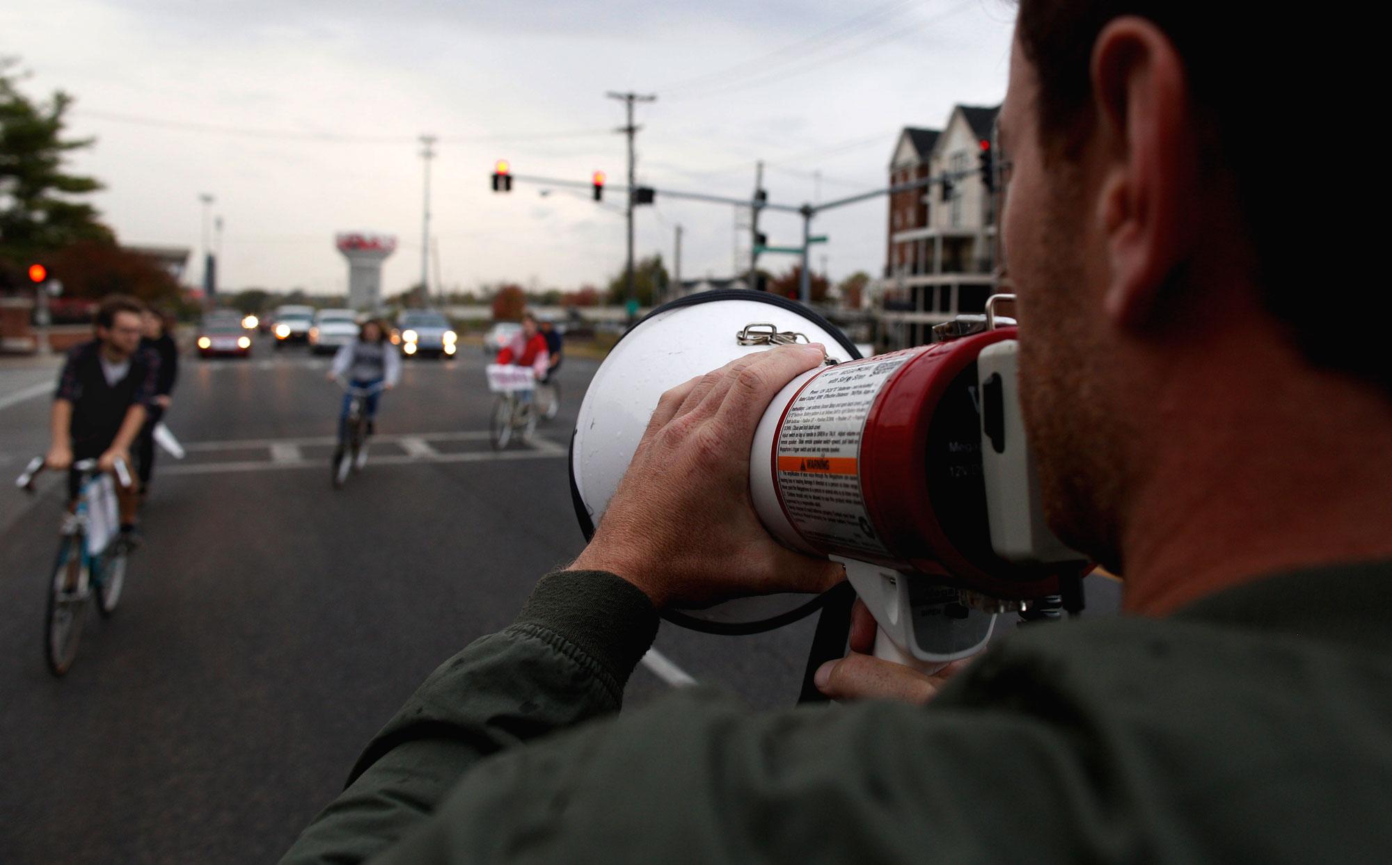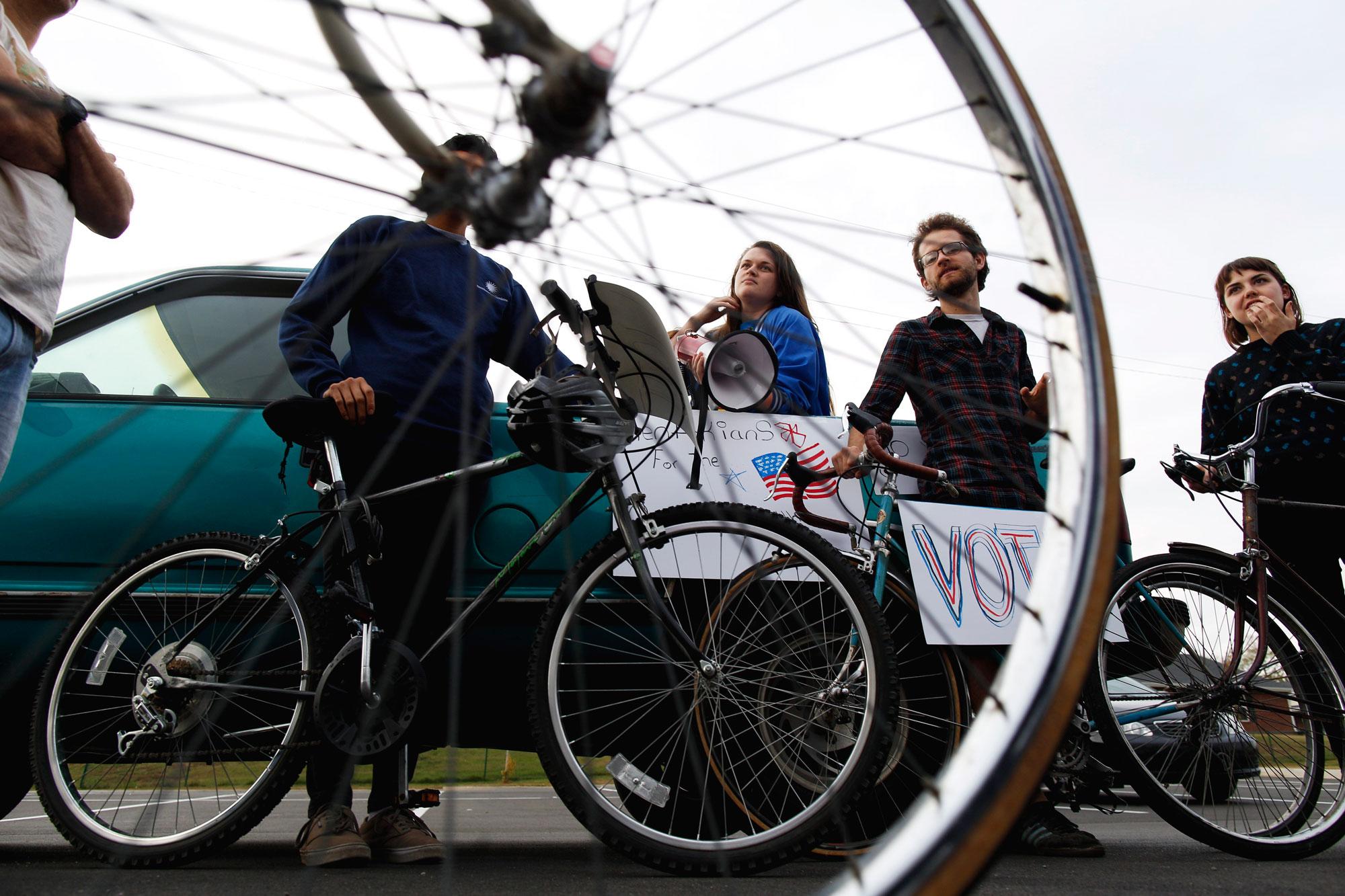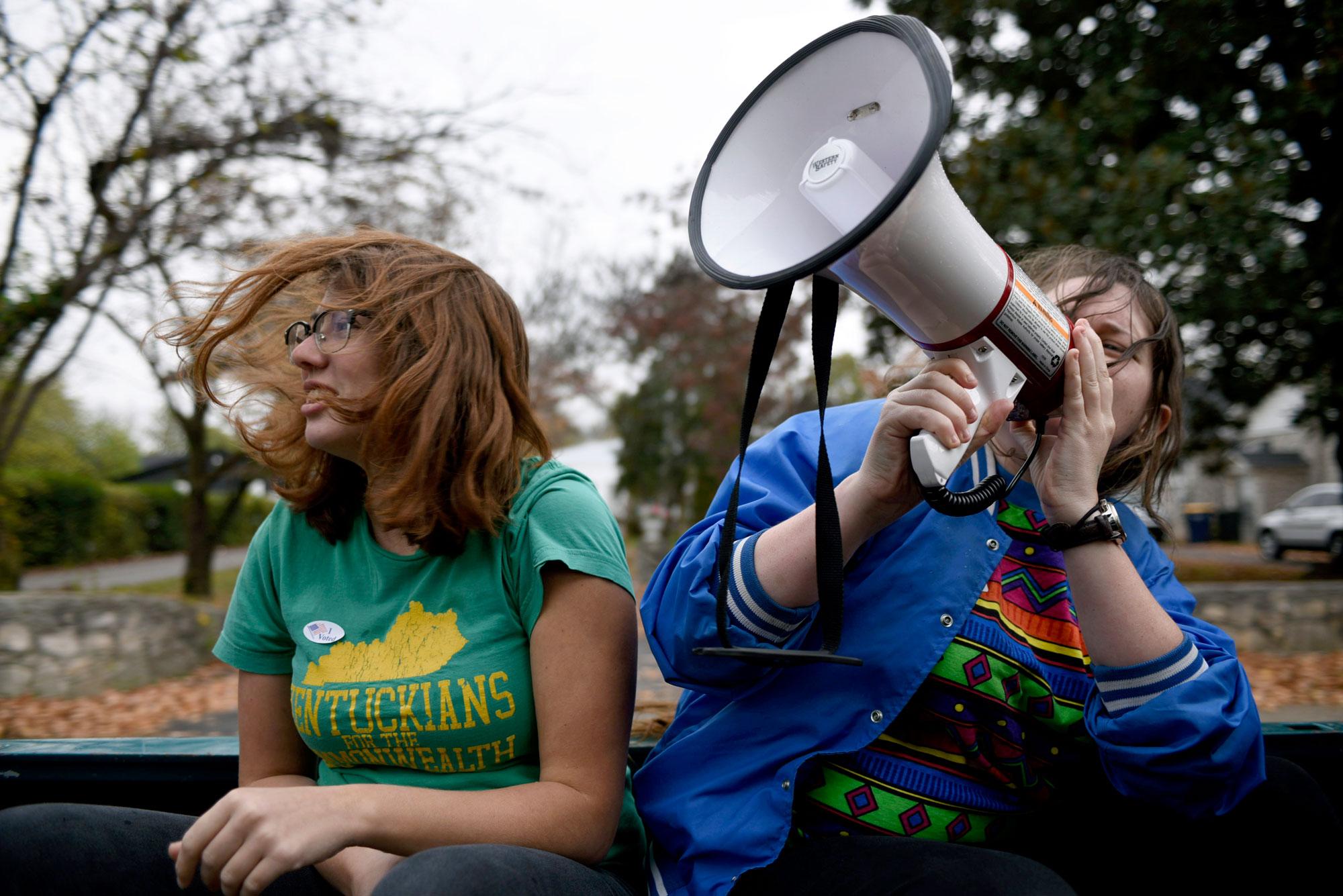 A volunteer at the Big Red precinct polling location prepares “I Voted” stickers. Election volunteers handed the stickers to voters as they left the polls on Tuesday, Nov. 8. Photo by Kathryn Ziesig.After waiting in line for 30 minutes at the Big Red precinct, Henderson senior Jenna Sauer finds out she is unable to vote on Tuesday, Nov. 8 due to a recently renewed license. “I’m like the most politically passionate person, so it’s really aggravating,” Sauer said. “I’m extremely mad. There was a girl before me that got turned away because of that, too.” Photo by Kathryn Ziesig.Bowling Green children design posters for the annual Election Day Bike Parade hosted by Kentuckians for the Commonwealth. Volunteers covered their bikes in posters and rode through the streets, encouraging people to get out and vote. Photo by Nic Huey.Molly Caviar, 24, and Angela Conway, 23, two WKU graduates encourage people to vote while riding around during the annual Election Day Bike Parade. The parade weaved its way through Bowling Green Tuesday afternoon. Photo by Nic Huey.Bowling Green residents participate in a bike parade to encourage other community members to encourage voter turnout. The event was organized by Kentuckians for Commonwealth. Photo by Shaban Athuman.Calvin Wiley, 31, of Barren County helps lead a bike parade from the back of a pickup truck. Wiley made announcements by imitating the voices of various political figures. Photo by Shaban Athuman.Barren County resident Calvin Wiley, 31, and Frankfort resident Angela Conway, 23, lead a bike parade to motivate and encourage Bowling Green residents to voice their opinion through voting. Wiley made announcements by imitating the voices of various political figures. Photo by Shaban Athuman.