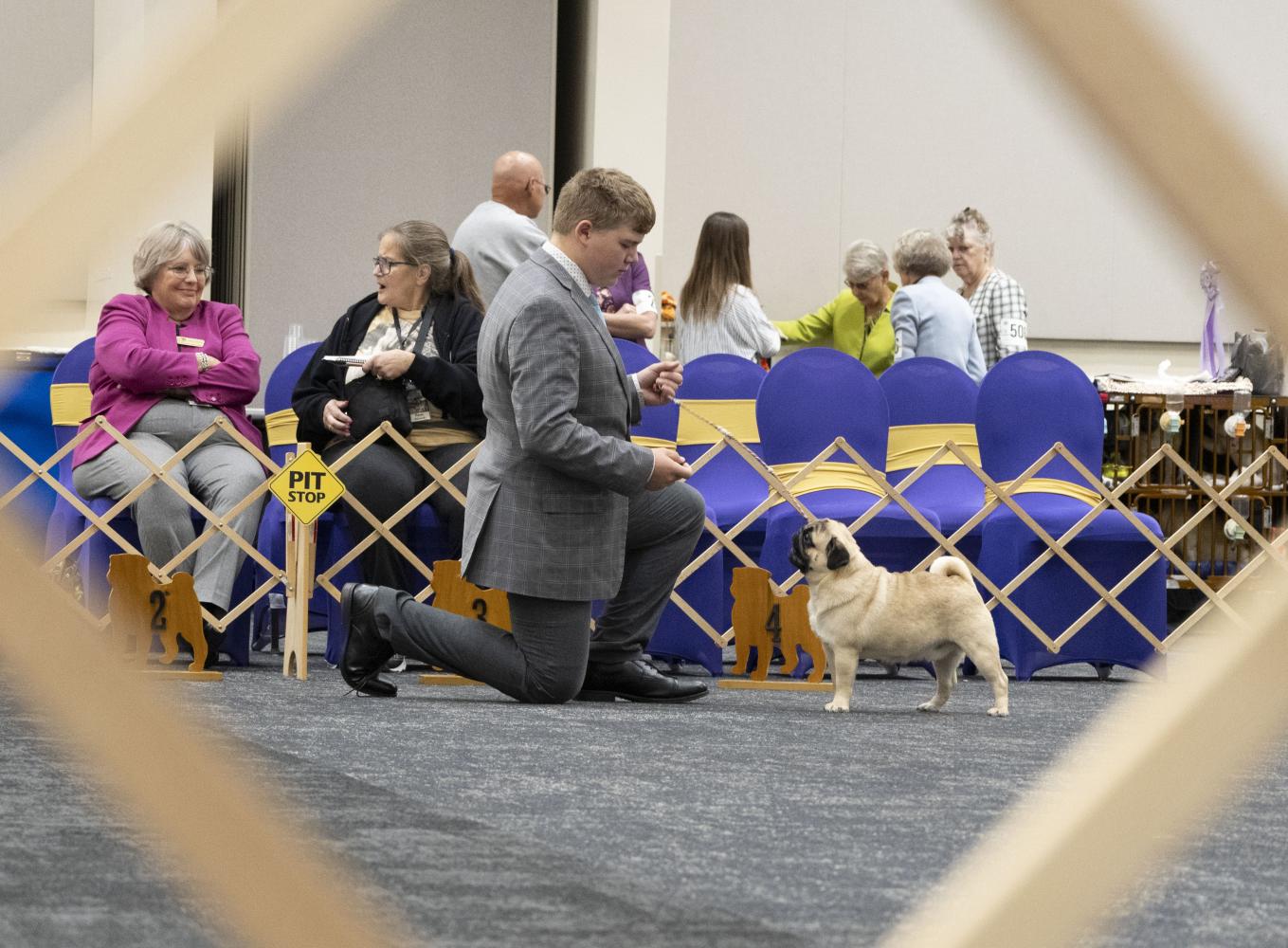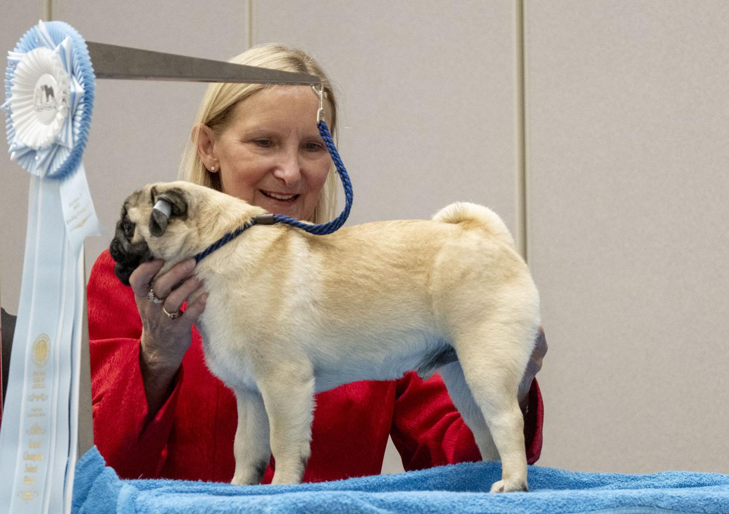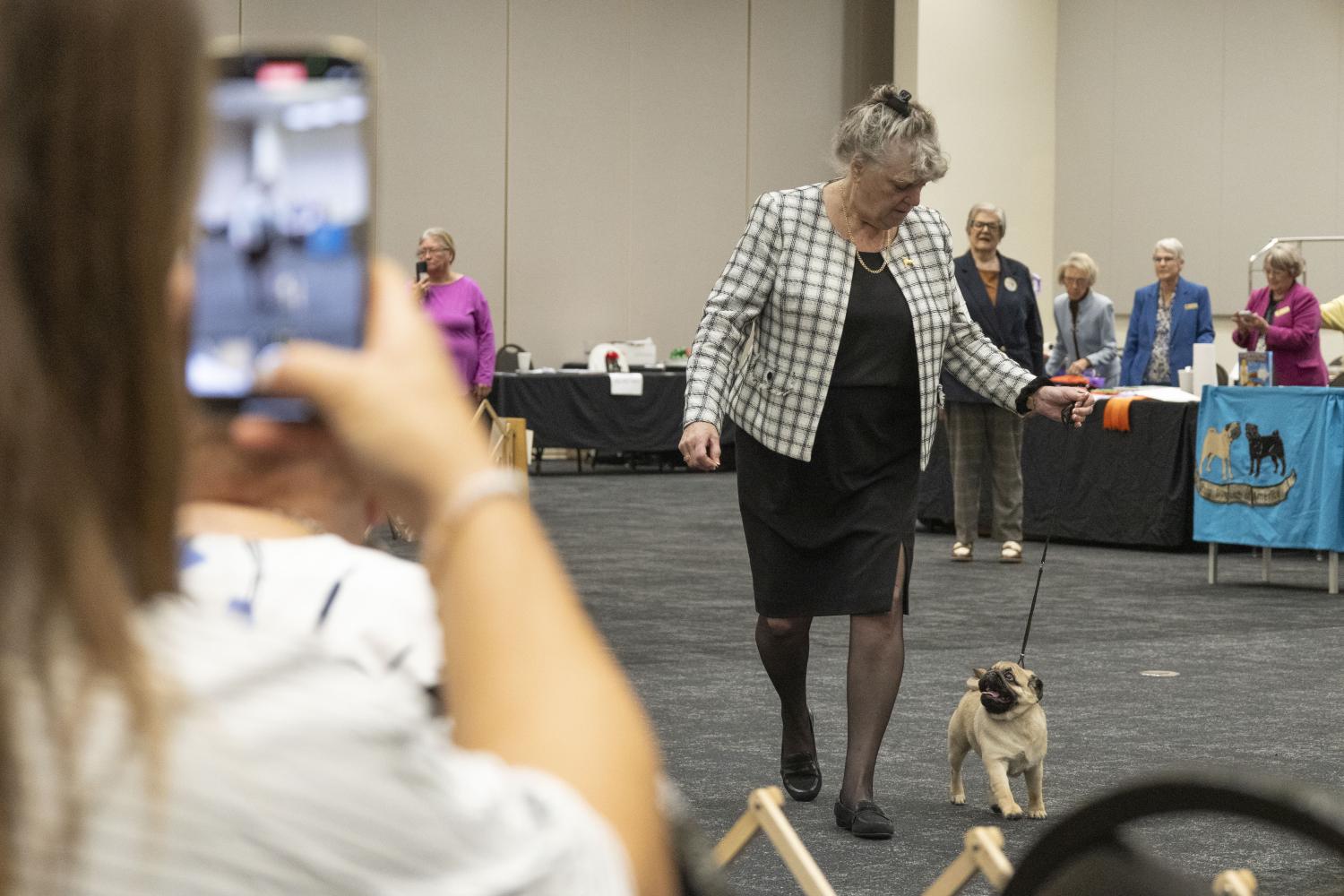 Pugs line up to compete during the 2025 Pug Dog Club of America National Specialty Show. Over 230 pugs competed. The show takes place in the Sloan Convention Center in Bowling Green from Monday, Oct. 6, to Saturday, Oct. 11. (Photo by Carlee Hite)An owner waits with her pug on the sidelines of the completion at the 2025 Pug Dog Club of America National Specialty Show. The show takes place in the Sloan Convention Center in Bowling Green from Monday, Oct. 6, to Saturday, Oct. 11. (Photo by Carlee Hite)Ribbons are on display at the 2025 Pug Dog Club of America National Specialty Show takes place at the Sloan Convention Center in Bowling Green from Monday, Oct. 6, to Saturday, Oct. 11. (Photo by Carlee Hite)Cynthia Cool, one of the judges for the 2025 Pug Dog Club of America National Specialty Show, talks with a competitor while judging their pug. The show takes place in the Sloan Convention Center in Bowling Green from Monday, Oct. 6, to Saturday, Oct. 11. (Photo by Carlee Hite)Four pugs wait in their crates on the sidelines of the 2025 Pug Dog Club of America National Specialty Show. The show takes place in the Sloan Convention Center in Bowling Green from Monday, Oct. 6, to Saturday, Oct. 11. (Photo by Carlee Hite)Courtney Penner (left) cheers for Carole Walker (right) and Hyclass Gettin’ Figgy Wit It Sito. Their pug is competing in the 4-6 Month Beginner Puppy Category. Penner has been showing dogs since she was four years old. Walker has been showing pugs since 2000. Both Penner and Walker traveled from Canada for the 2025 Pug Dog Club of America National Specialty Show. The show takes place at the Sloan Convention Center in Bowling Green from Monday, Oct. 6, to Saturday, Oct. 11. (Photo by Carlee Hite)Renee Rosamilia’s pug, Tyler, jumps inside a gate at Sloan Convention Center on Tuesday, Oct. 7. They traveled from Florida to compete in the 2025 Pug Dog Club of America National Specialty Show. Rosamilia works as a professional handler. (Photo by Carlee Hite)Barbara Johnson (left) and Dee Bardin (right) groom Cadbury for his competition. Johnson and Bardin both traveled from North Carolina to compete in the 2025 Pug Dog Club of America National Specialty Show. The show takes place at the Sloan Convention Center in Bowling Green from Monday, Oct. 6, to Saturday, Oct. 11. (Photo by Carlee Hite)Grooming materials and a fourth-place ribbon lie on a table in the grooming room of the 2025 Pug Dog Club of America National Specialty Show. The show takes place in the Sloan Convention Center in Bowling Green from Monday, Oct. 6, to Saturday, Oct. 11. (Photo by Carlee Hite)Caryl Ann Baxter holds Roxy, a 13-month-old pug, as she awaits her turn with the judge during the 2025 Pug Dog Club of America National Specialty Show. The show takes place in the Sloan Convention Center in Bowling Green from Monday, Oct. 6, to Saturday, Oct. 11. Baxter has shown pugs for 15 years and has a book about pugs titled “Mimi: When I Get Big.” (Photo by Carlee Hite)Linda Wright prepares Romeo, a six-month-old pug, for his competition at the 2025 Pug Dog Club of America National Specialty Show. Wright, a Michigan native, has been showing pugs since 1989. (Photo by Carlee Hite)A pug awaits judging at the 2025 Pug Dog Club of America National Specialty Show. The show takes place in the Sloan Convention Center in Bowling Green from Monday, Oct. 6, to Saturday, Oct. 11. (Photo by Carlee Hite)Handler Stacy Weatherford grooms her fawn pug bitch for competition at the 2025 Pug Dog Club of America National Specialty Show. The show takes place in the Sloan Convention Center in Bowling Green from Monday, Oct. 6, to Saturday, Oct. 11. (Photo by Carlee Hite)Hannah Ogle (9) lifts Roxy as she prepares for her first-ever pug show. Ogle has grown up showing whippets and corgis, but this was her first pug competition. Ogle was the youngest competitor in the junior category at the 2025 Pug Dog Club of America National Specialty Show. The show takes place at the Sloan Convention Center in Bowling Green from Monday, Oct. 6, to Saturday, Oct. 11. (Photo by Carlee Hite)Andrew Sullivan poses with his pug Toby. The duo won best junior handler on Tuesday, Oct. 7, at the 2025 Pug Dog Club of America National Specialty Show. The event takes place at the Sloan Convention Center in Bowling Green. Sullivan traveled from upstate New York to compete in the show. (Photo by Carlee Hite)Andrew Sullivan shows his pug at the Sloan Convention Center in Bowling Green. Sullivan and his pugs traveled from New York for the 2025 Pug Dog Club of America National Specialty Show. (Photo by Carlee Hite)A pug awaits their competition at the 2025 Pug Dog Club of America National Specialty Show. The show takes place in the Sloan Convention Center in Bowling Green from Monday, Oct. 6, to Saturday, Oct. 11. (Photo by Carlee Hite)Grooming brushes and other materials lie in a container in the grooming room of the 2025 Pug Dog Club of America National Specialty Show. The show takes place in the Sloan Convention Center in Bowling Green from Monday, Oct. 6, to Saturday, Oct. 11. (Photo by Carlee Hite)