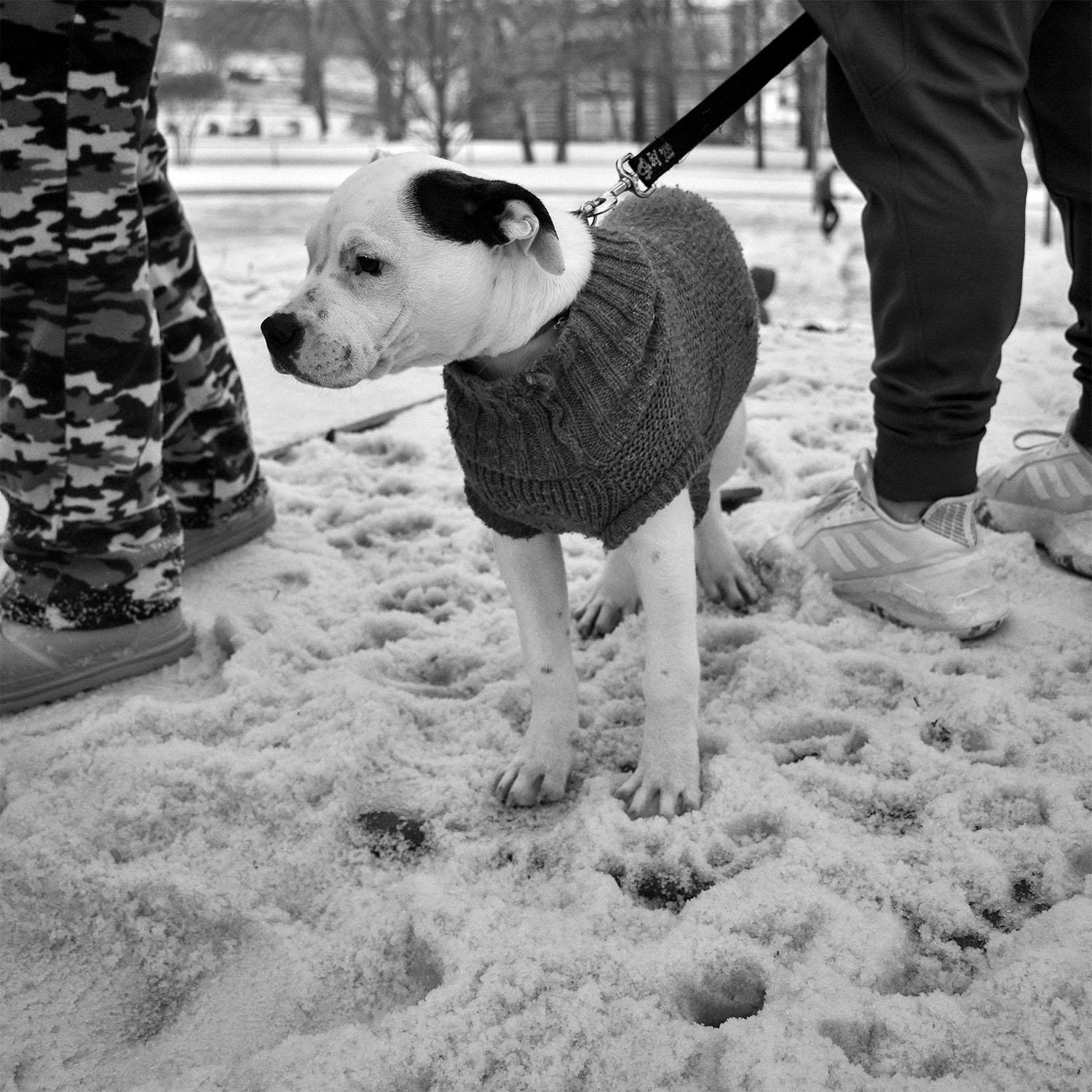 Many dogs, wrapped in coats and blankets, joined in on the snow day sledding at Van Meter Hill on Feb. 15. (Photo by Veronica Teeter)