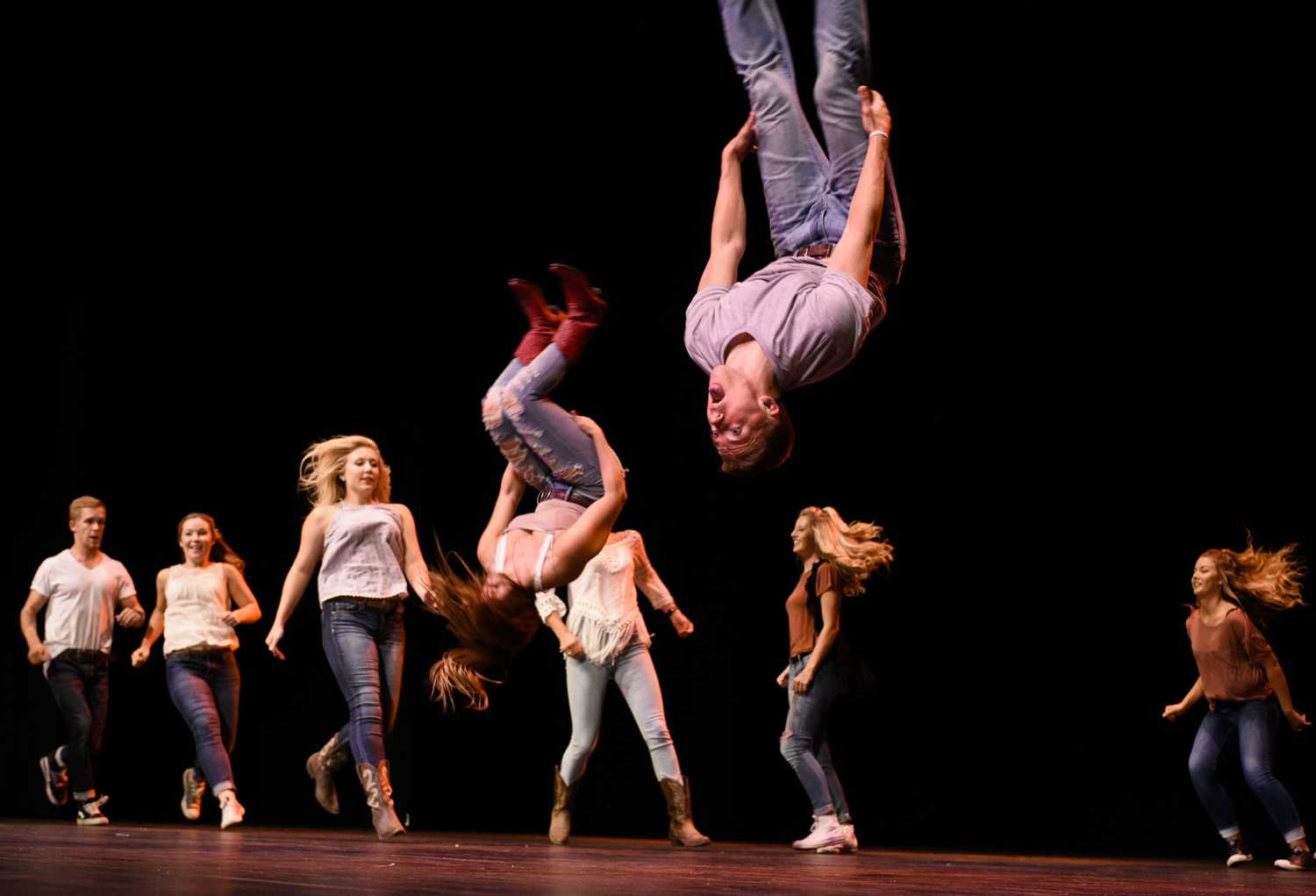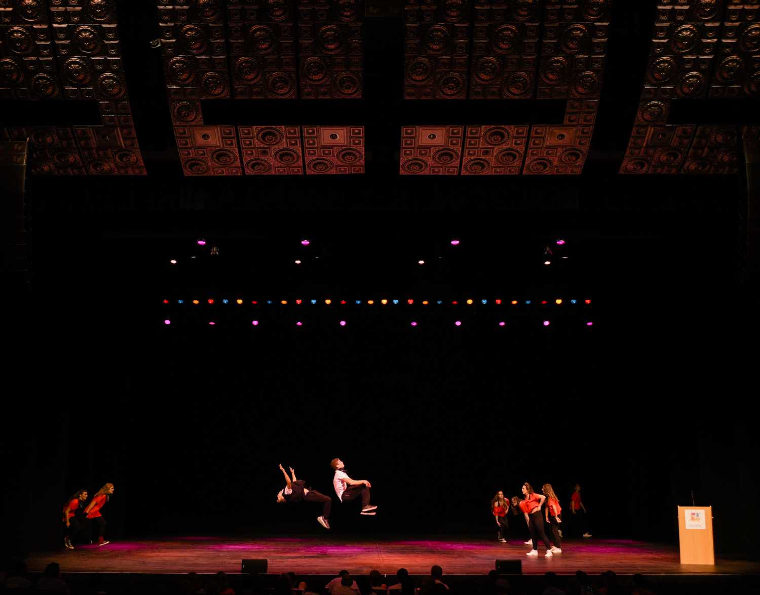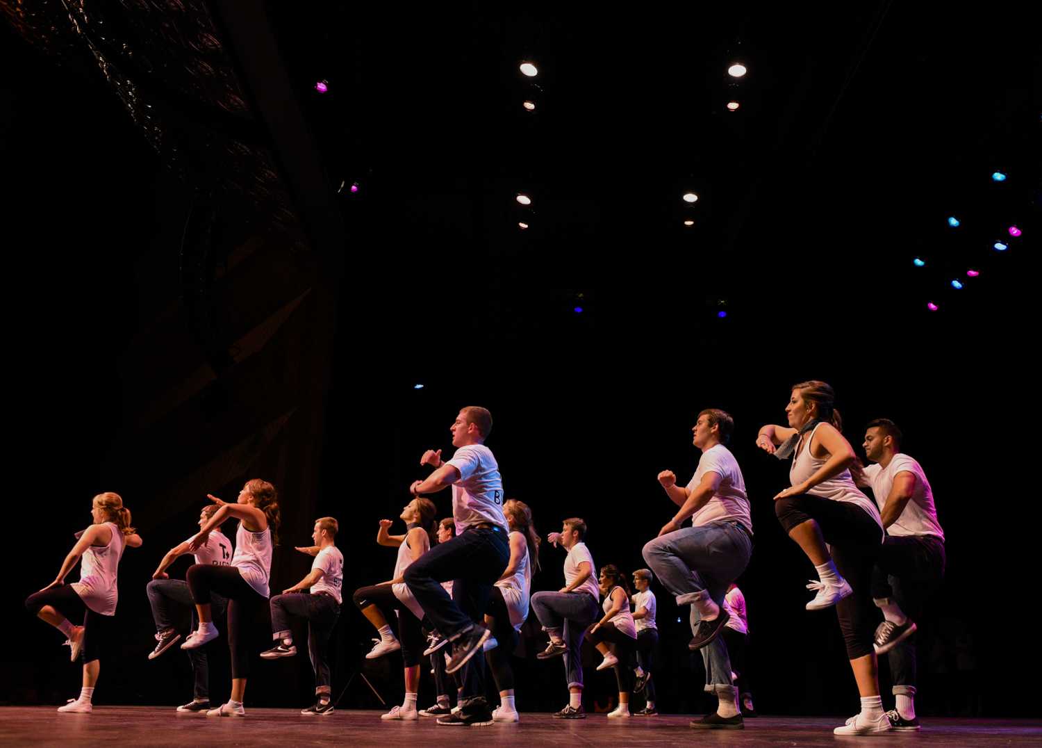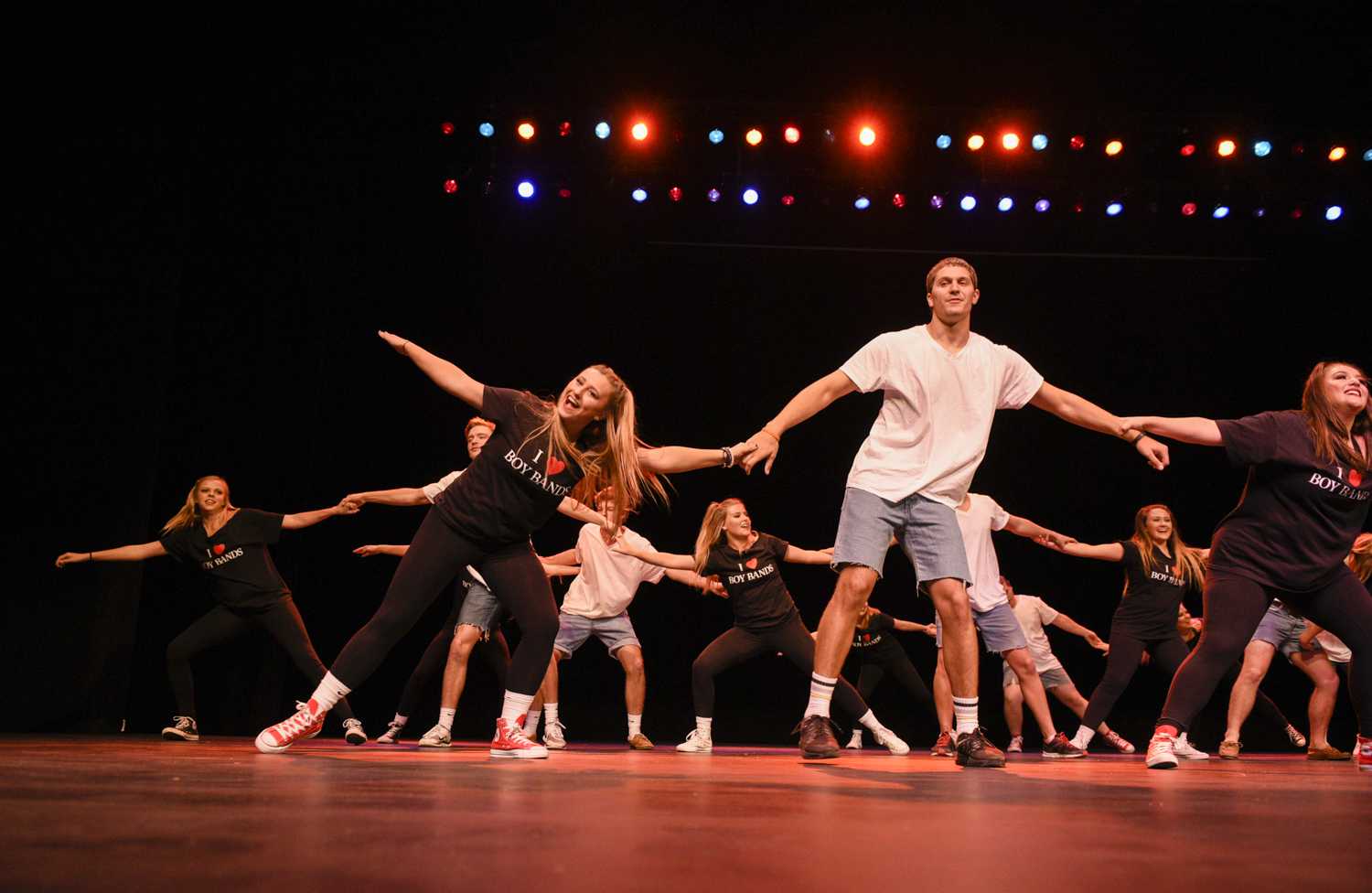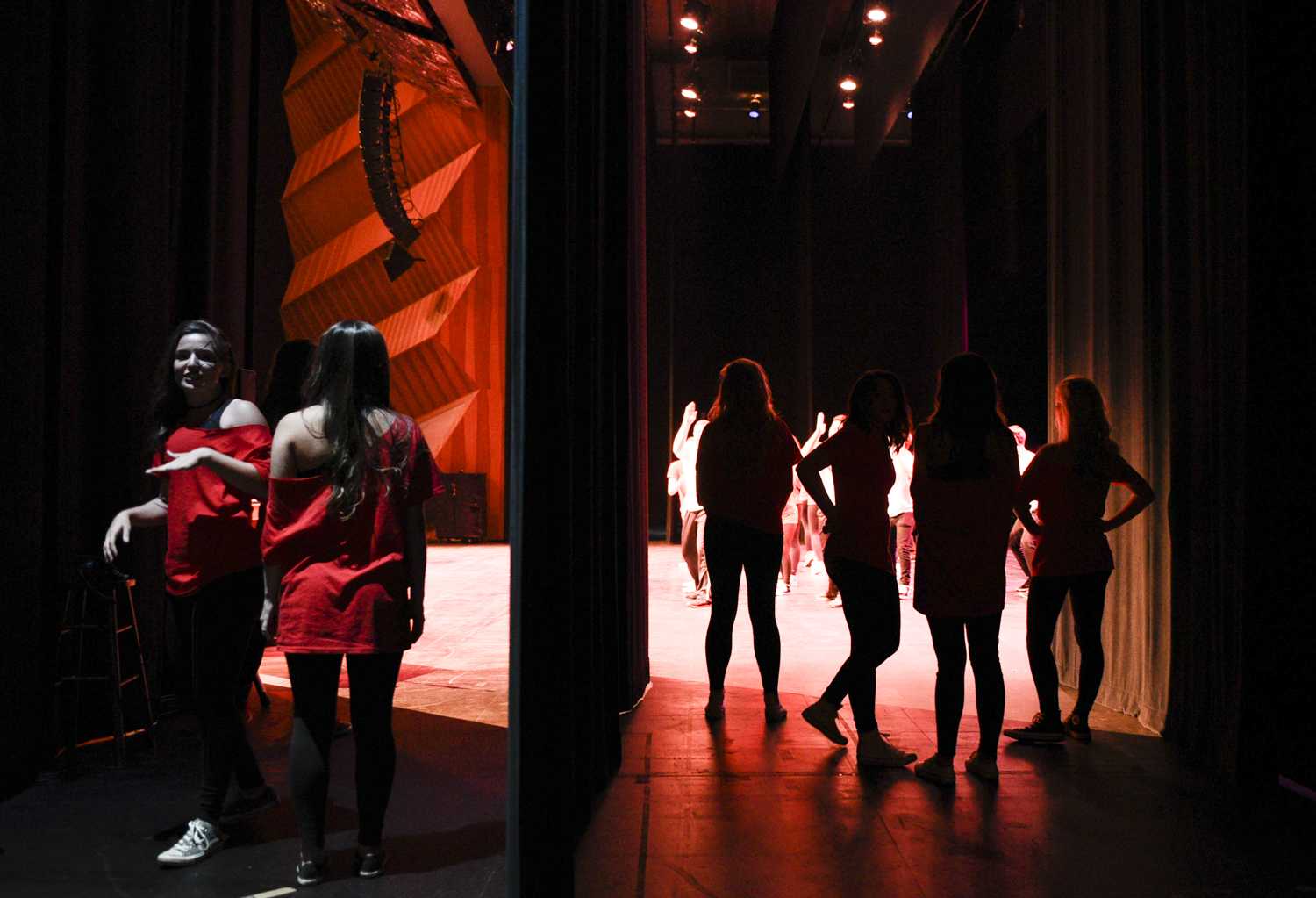 Chi Omega sorority members and Sigma Nu fraternity members do backflips across the stage as they close out the show with their “Banding Together to Find Our Sound” performance at Shenanigans. Shenanigans was an annual fundraiser hosted by Kappa Delta sorority.Phi Mu sorority members dance in a line for their “Banding Together the 70s” routine during Shenanigans on Oct. 4.The women of Chi O stand backstage during their performance. The Sigma Nus and the Chi Os were last to go on stage.After a costume change, Phi Mu members take the stage again for their “Battle of the Bands” performance. They performed alongside members of Phi Delt.AOPi members pose for a photo in the SKyPAC lobby before their Shenanigans performance. The AOPis performed alongside Pi Kappa Alpha fraternity.AOPi and Pike members dance together during their “Banding Together the 70s” show. The AOPis and Pikes walked away with the first place trophy.Members of Alpha Xi Delta sorority, Kappa Alpha order and FarmHouse fraternity perform their “Evolution of Boy Bands” routine on Oct. 4 at the SKyPAC theater. The Shenanigans event, a fundraiser for KD, packed the theater to its capacity.LaGrange senior Schuyler McCaig raises Newburgh, Indiana, sophomore Maxi McDaniel’s hand during a performance. Their show featured re-enacted scenes and sound bites from Suicide Squad.Clothes from the first half of Kappa Sigma fraternity’s show lay on the floor backstage. The backstage area was constantly abuzz with activity as some fraternities and sororities had as many three or four costume changes during their performances.Members of Alpha Delta Pi sorority and Phi Gamma Delta fraternity do backflips for their Footloose-themed performance at SKyPAC on Oct. 4.A member of the SKyPAC technical crew runs sound during Shenanigans. Each act consisted of several songs stitched together with lip-synced conversations and skits in between.Alpha Gamma Delta members dance in cowboy boots during their “Let’s Make a Band” routine at Shenanigans, which featured dancing from several genres of music.