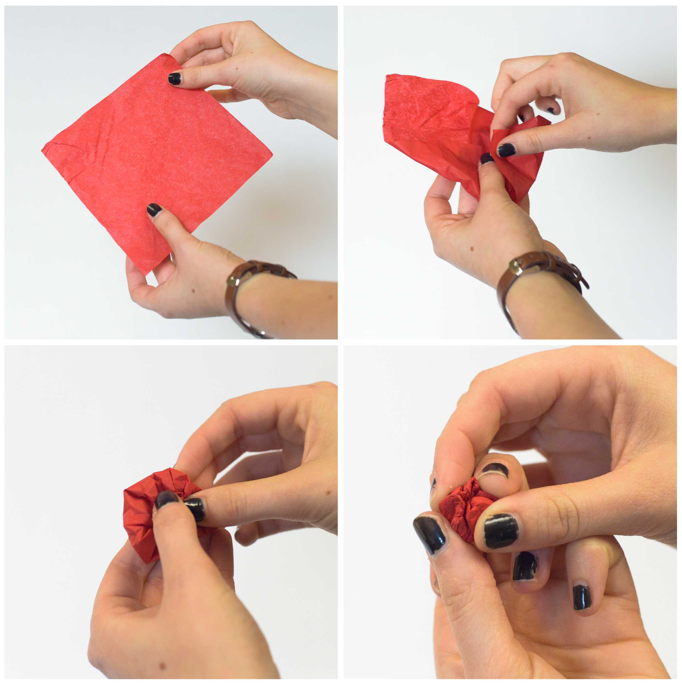 Step Two: Begin folding in the corners of the tissue paper so that they meet in the middle.