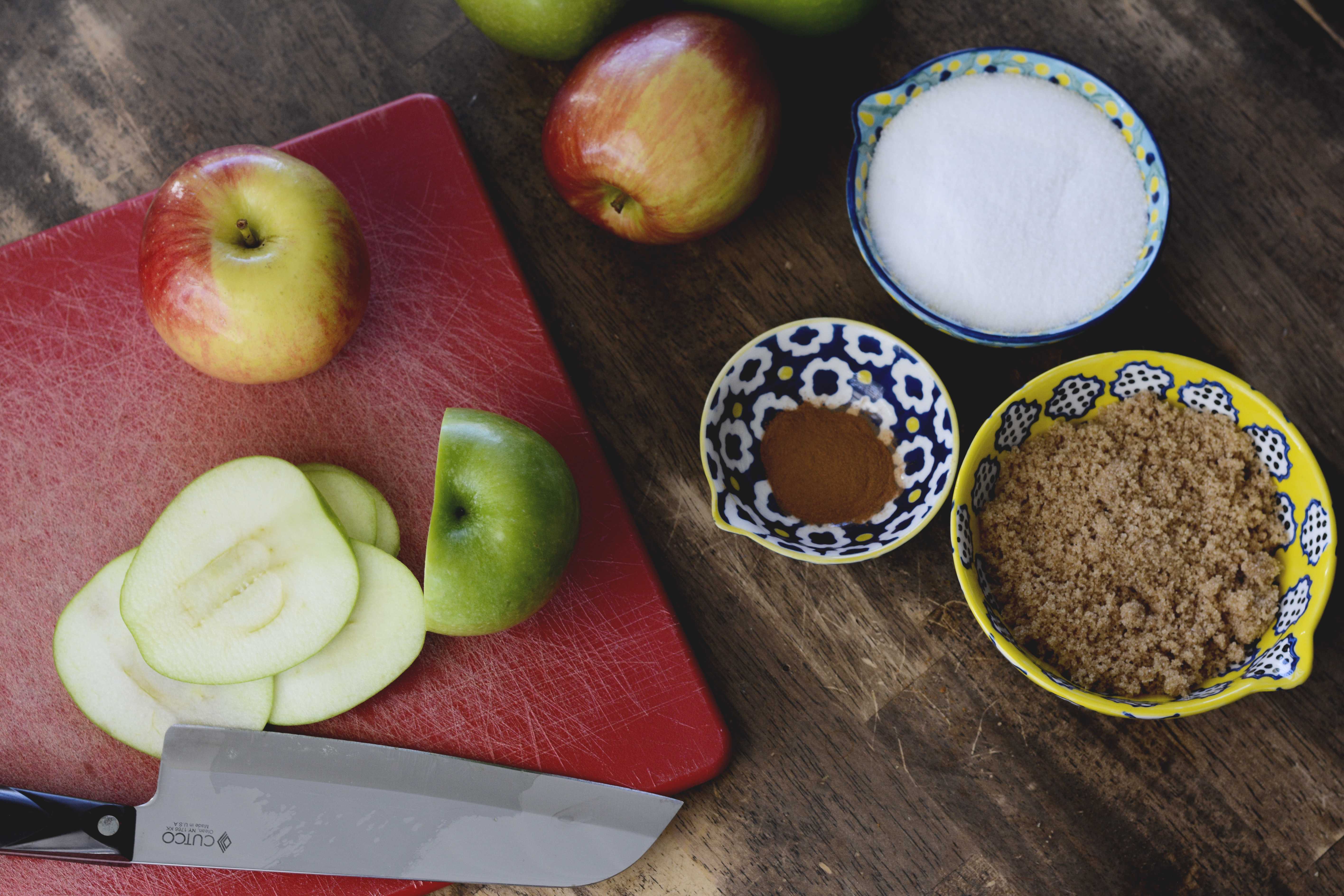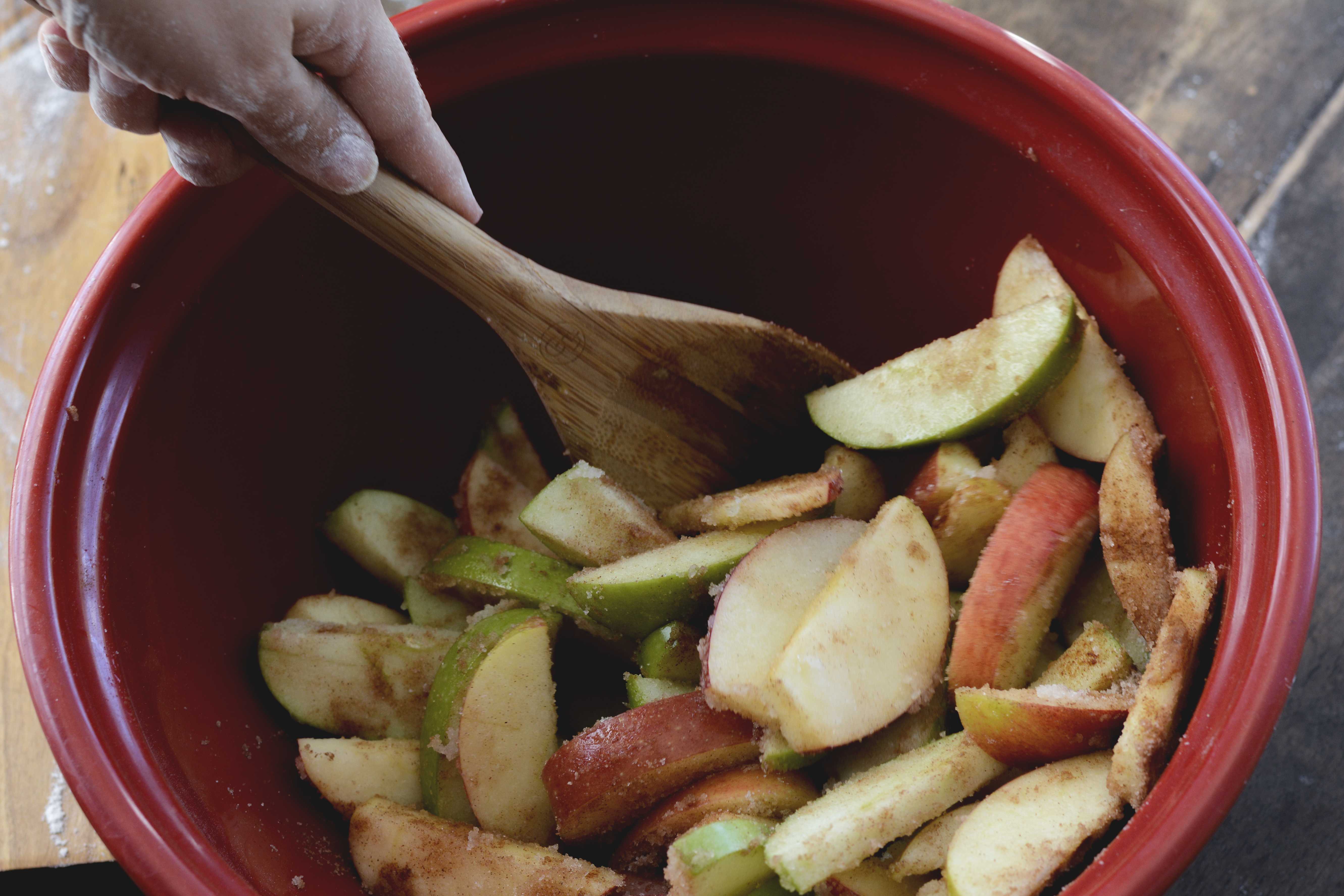4. Peel and cut apples, and add to a mixture of cinnamon and sugar.