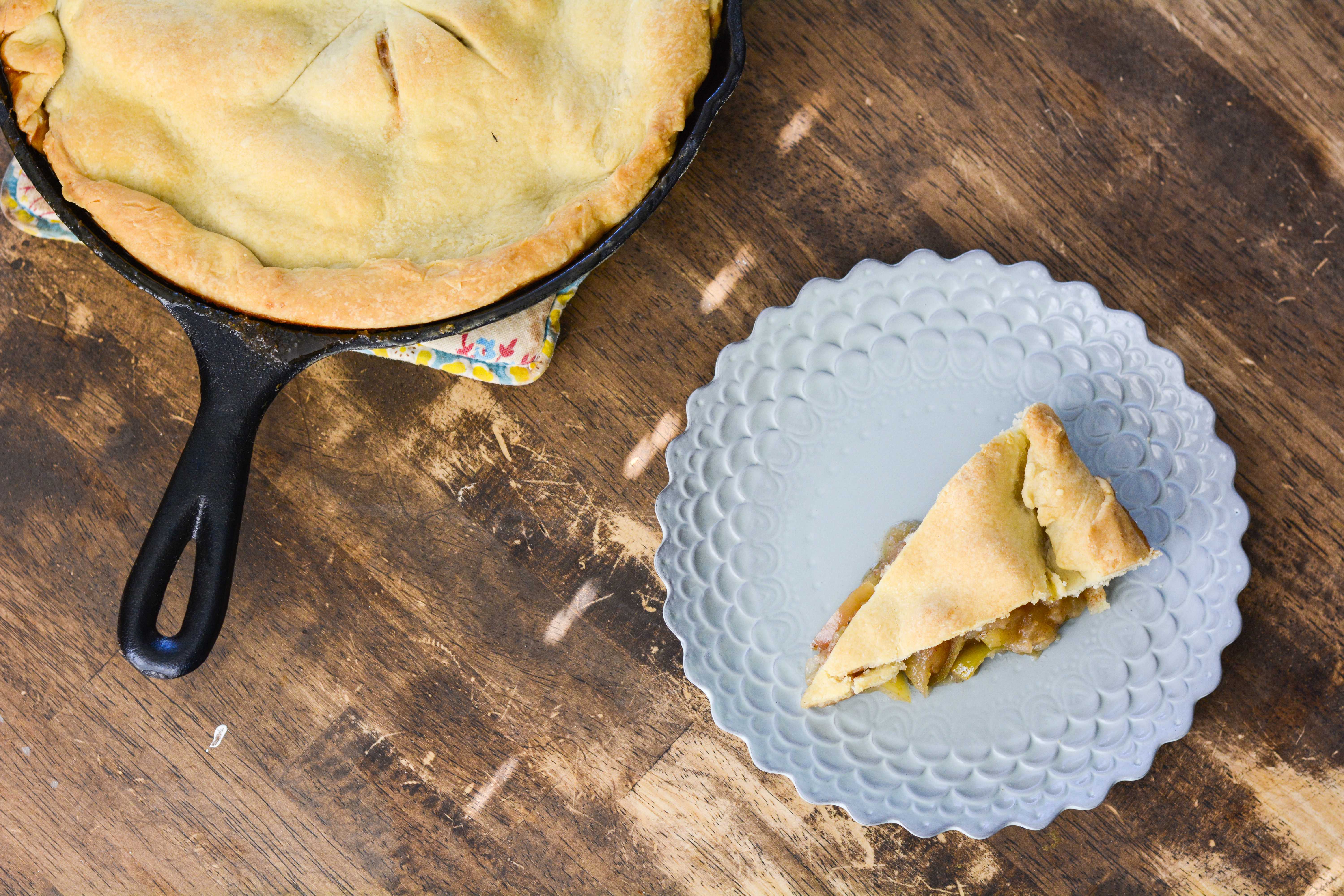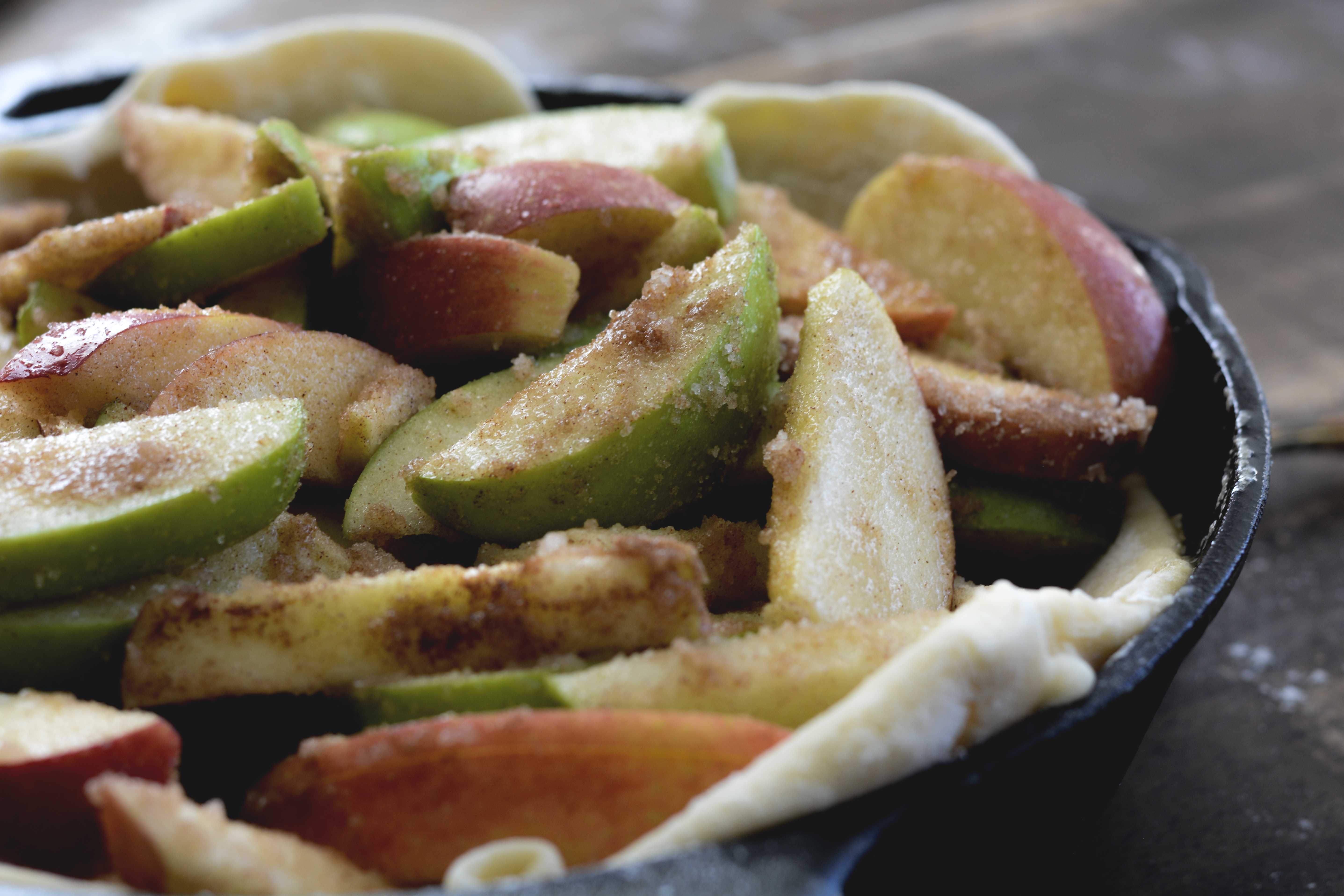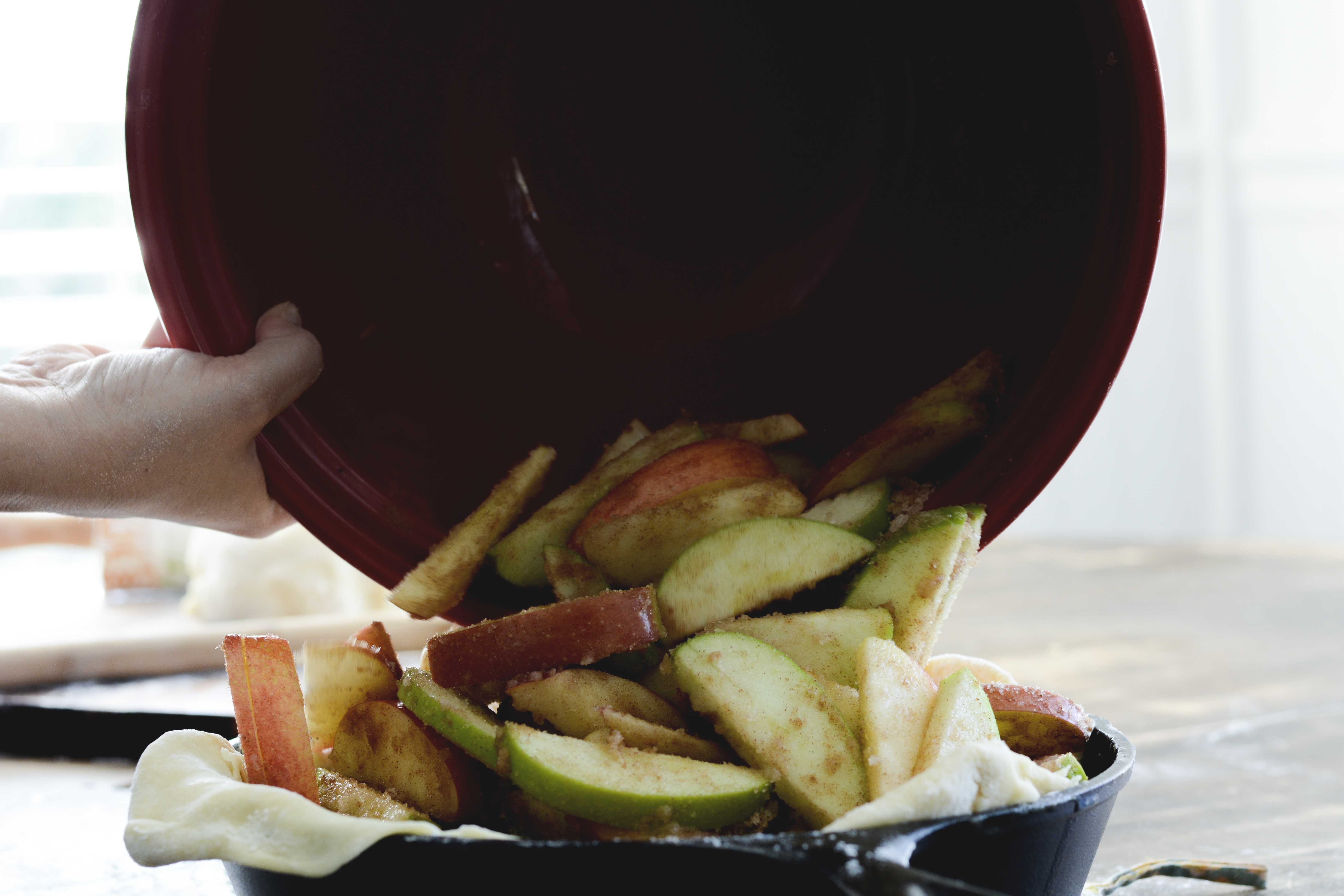 3. Place the first pie crust in the bottom of the cast-iron skillet, covering the brown sugar mixture.