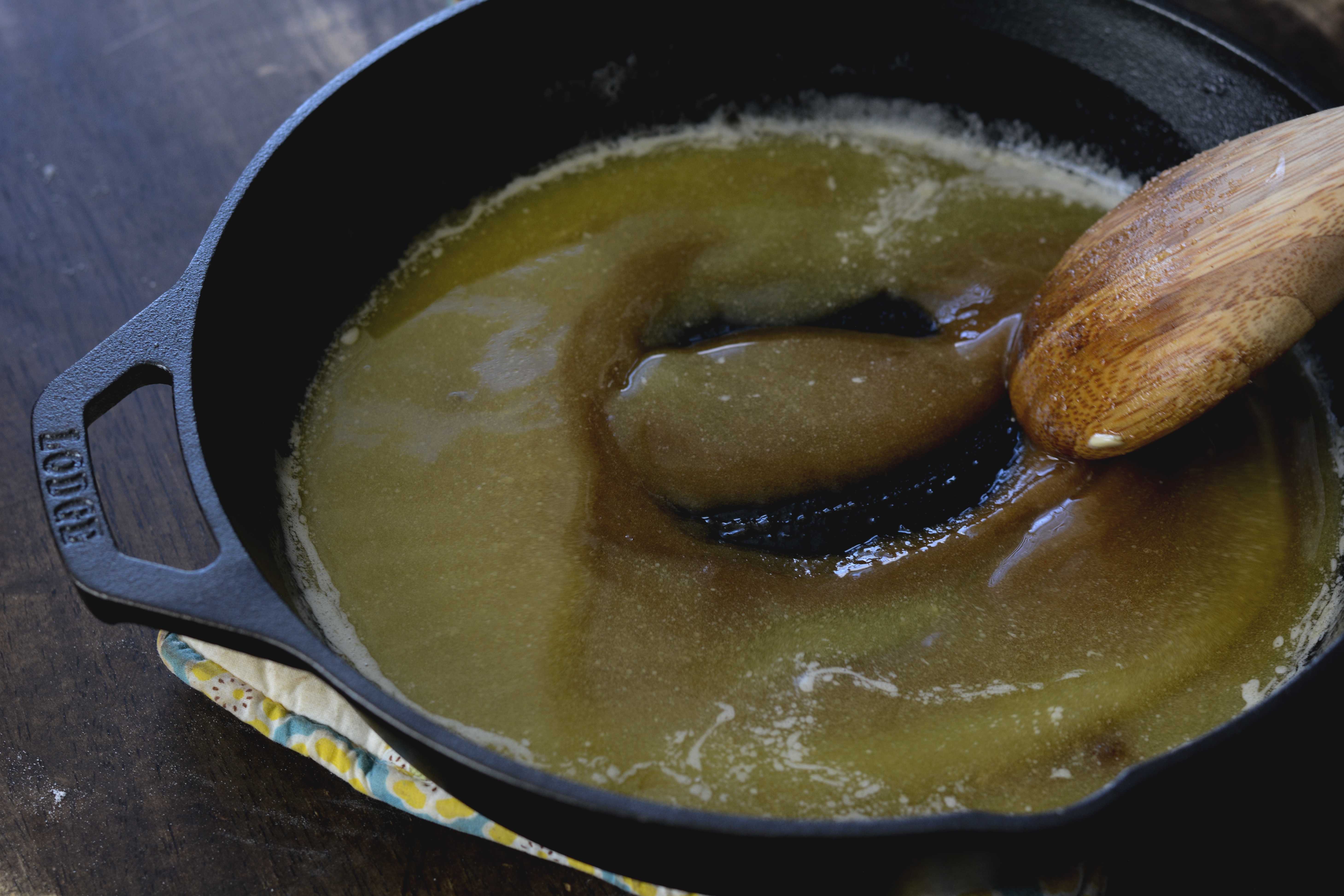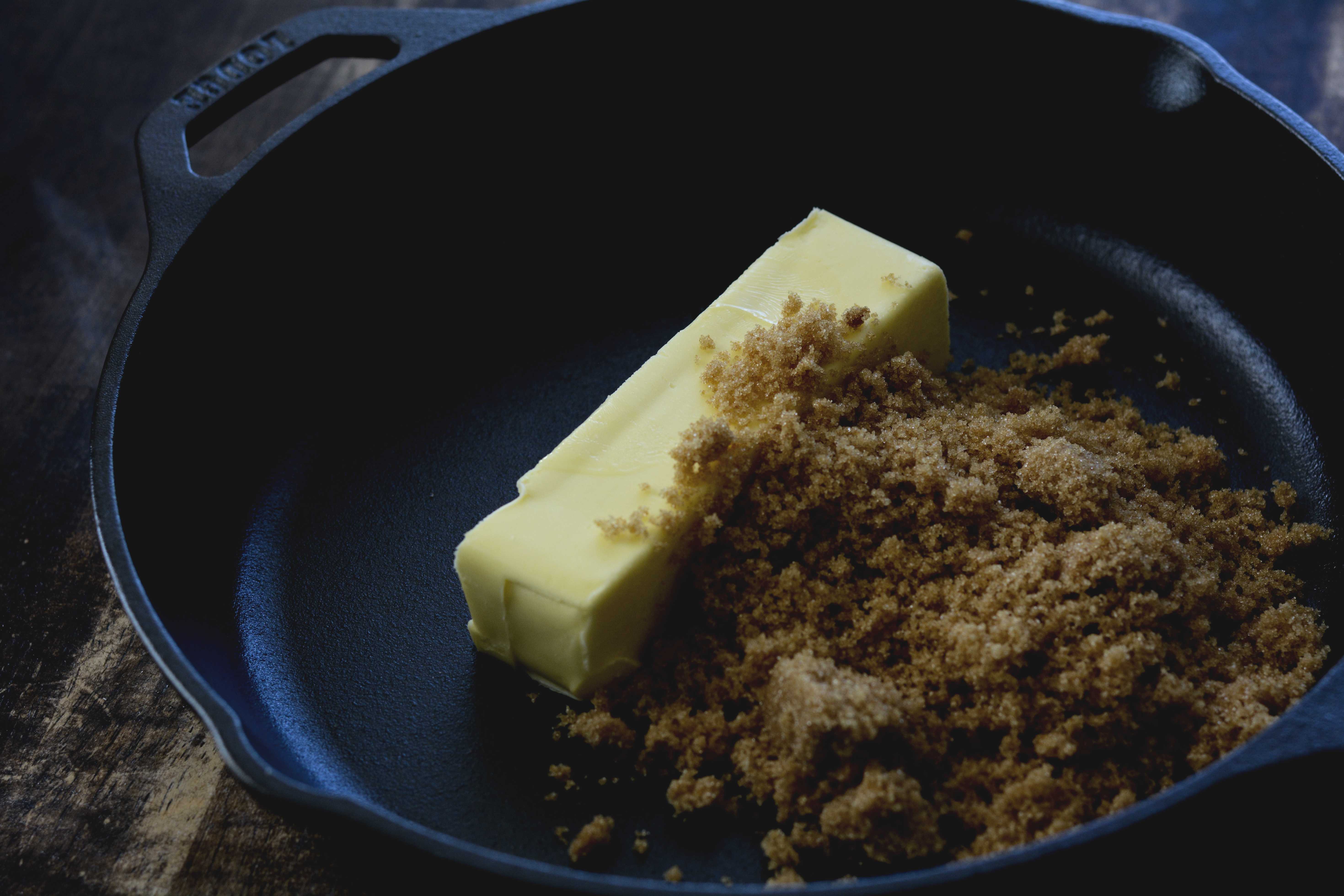 2. Melt butter in a cast-iron skillet and add brown sugar. Stir constantly until sugar is dissolved, and then remove the pan from heat.