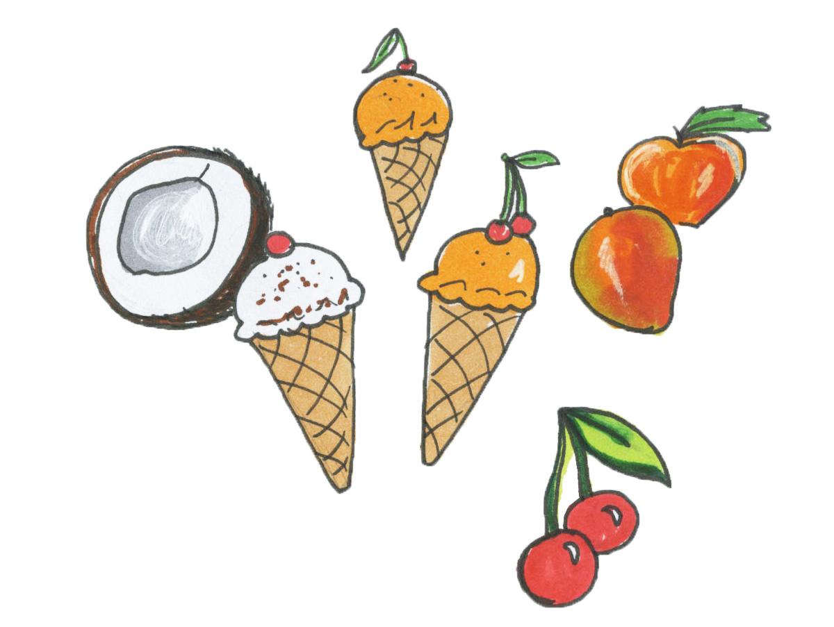 Bruster’s features strawberry sorbet year-round and usually an additional flavor, too. My favorites are coconut, mango and peach. Their waffle cones contain eggs, so try it in a sugar or cake cone instead.