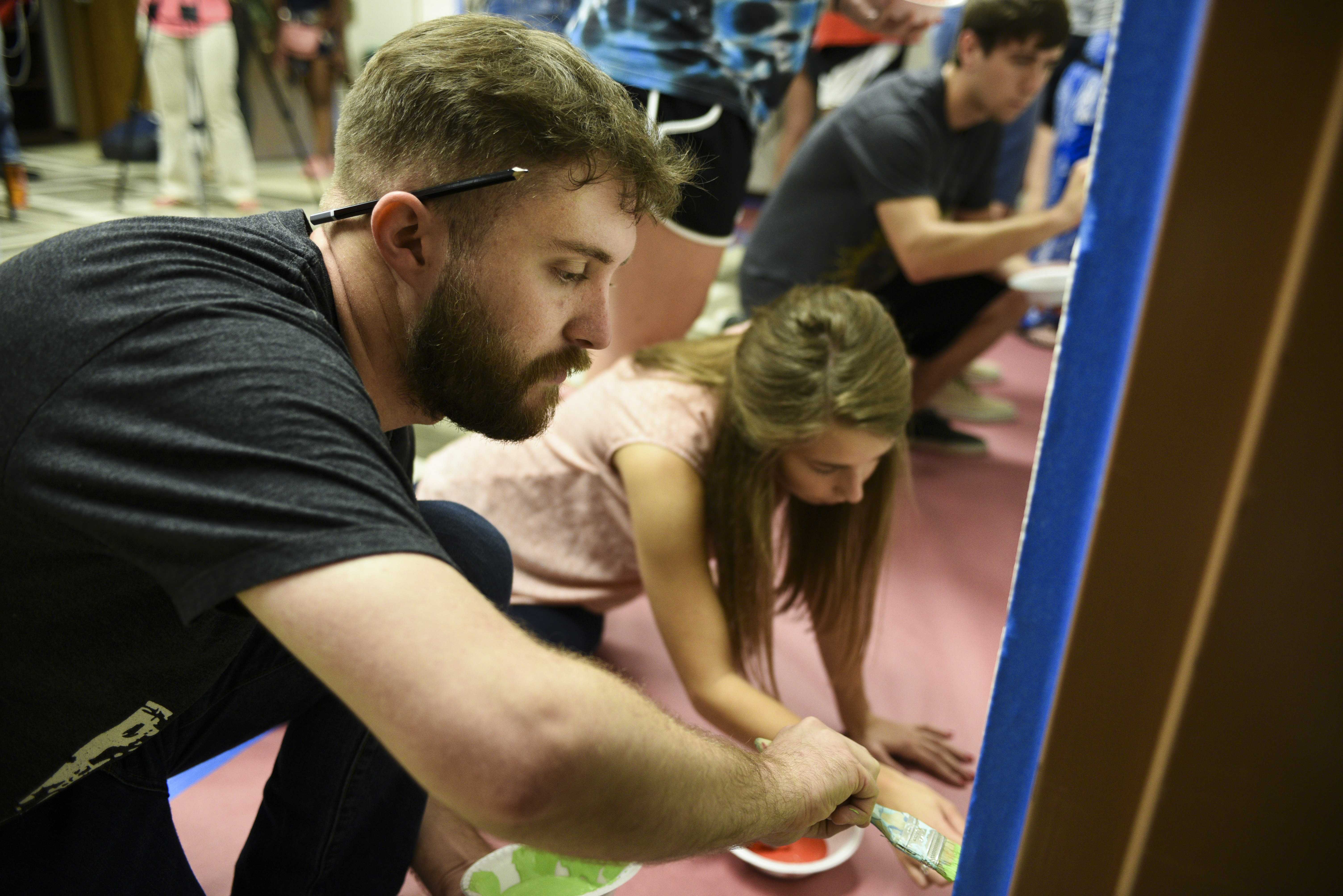 On Friday, the newly reorganized Center for Citizenship and Social Justice hosted its first event — a brainstorming session for a collaborative student mural project called “The Great Wall of Service.” On Wednesday afternoon, students, facilitated by local artist Andee Rudloff, began painting the mural, which now covers a couple of bare, white walls in the CCSJ office in Tate Page Hall.